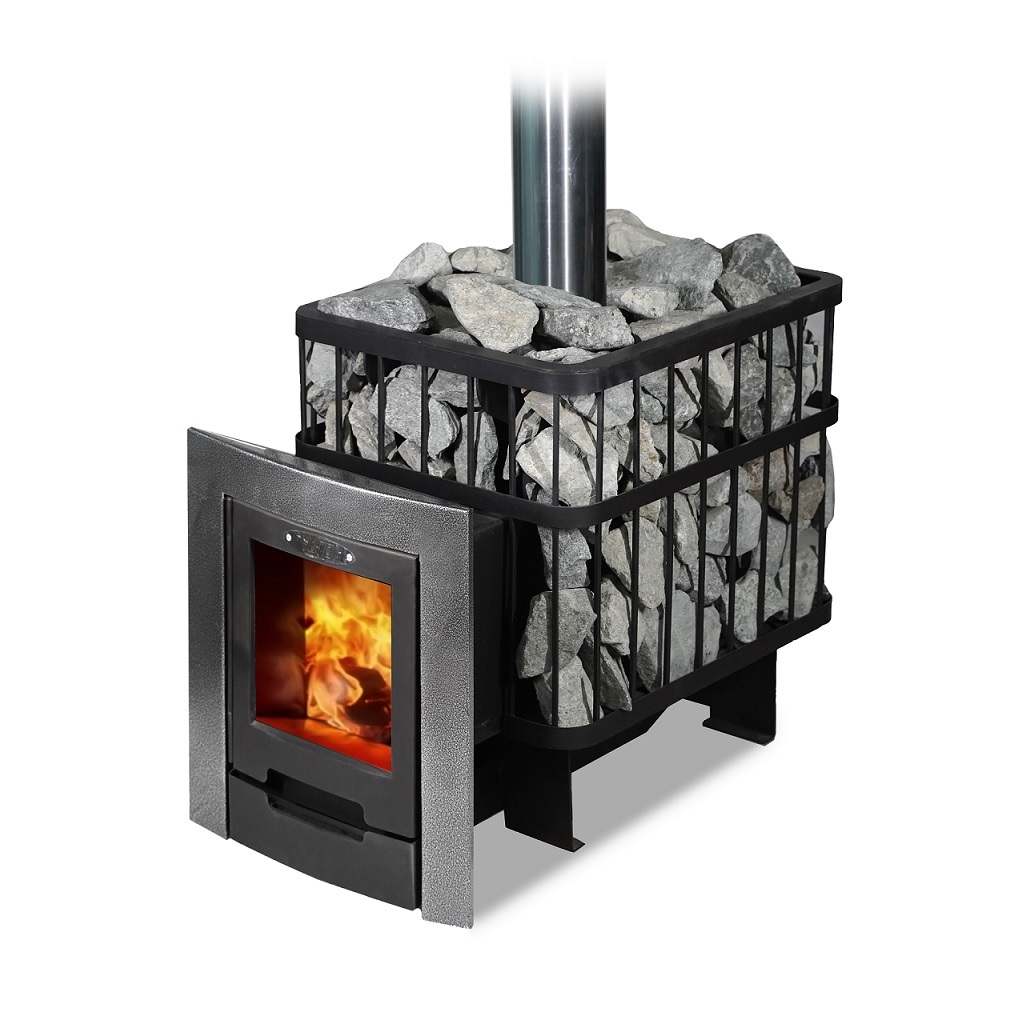 Банная печь оснащена стальной дверкой со стеклом, благодаря которому можно наслаждаться горением дров из комнаты отдыха.