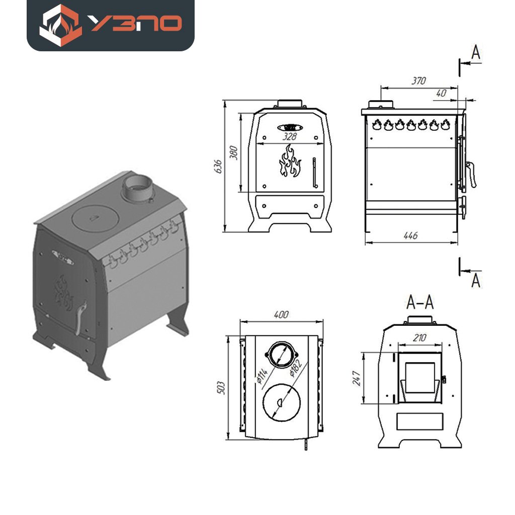 Продолжительный срок службы, достигается благодаря увеличенной толщине свода топки до 4 мм. Проём дверцы топки (210 мм х 247 мм) позволяет удобно наполнять печь дровами. Рекомендуемая длина дров 40 см. За счет конвекционного кожуха, печь «Теплушка 100» не только быстро прогреет помещение до 40 кв.м., но и защитит от жесткого инфракрасного излучения. Печь имеет широкую, плоскую верхнюю плиту со съемной конфоркой, позволяющая не только готовить или разогревать пищу, но и прочищать от сажи верхнюю часть печи.