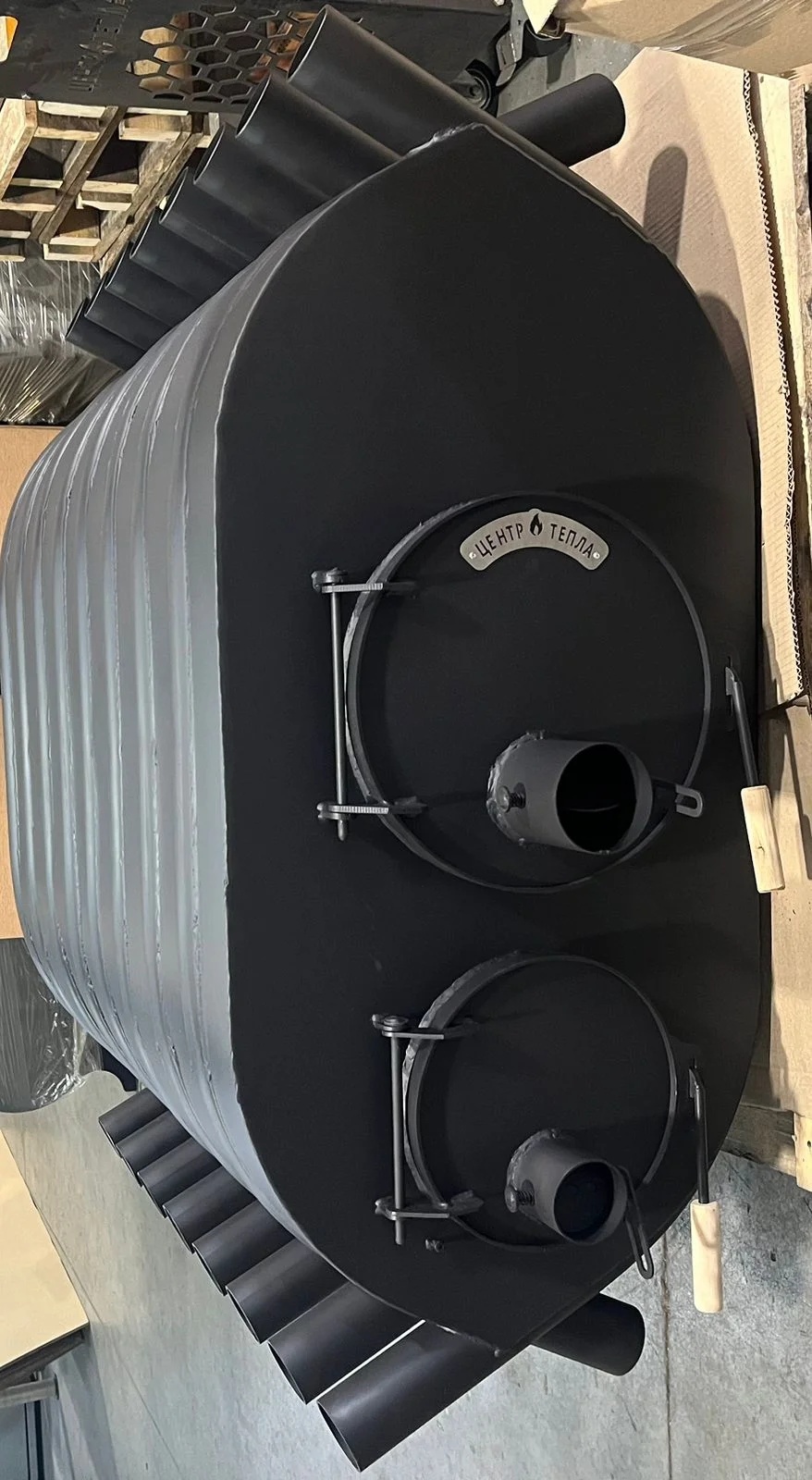Печи для больших помещений площадью до 800 м² (объемом до 2000 м³). Конструкция из 16 воздуховодов диаметром 76 мм обеспечивает быстрое распределение тепла по всему объему. Большая 796 л и глубокая 1200 мм топка позволяет использовать длинные дрова. Длительность горения на одной загрузке топлива до 12 часов!