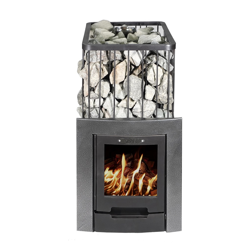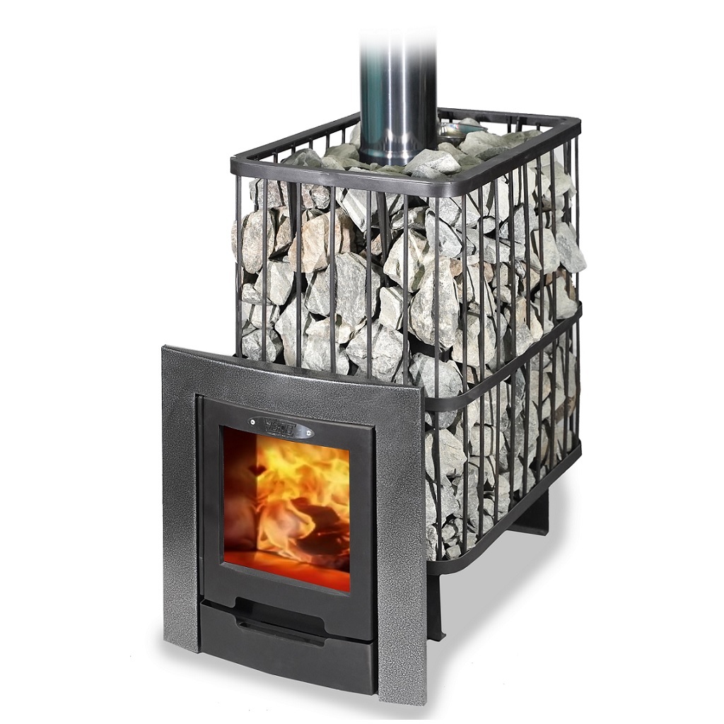 Банная печь оснащена стальной дверкой со стеклом, благодаря которому можно наслаждаться горением дров из комнаты отдыха.